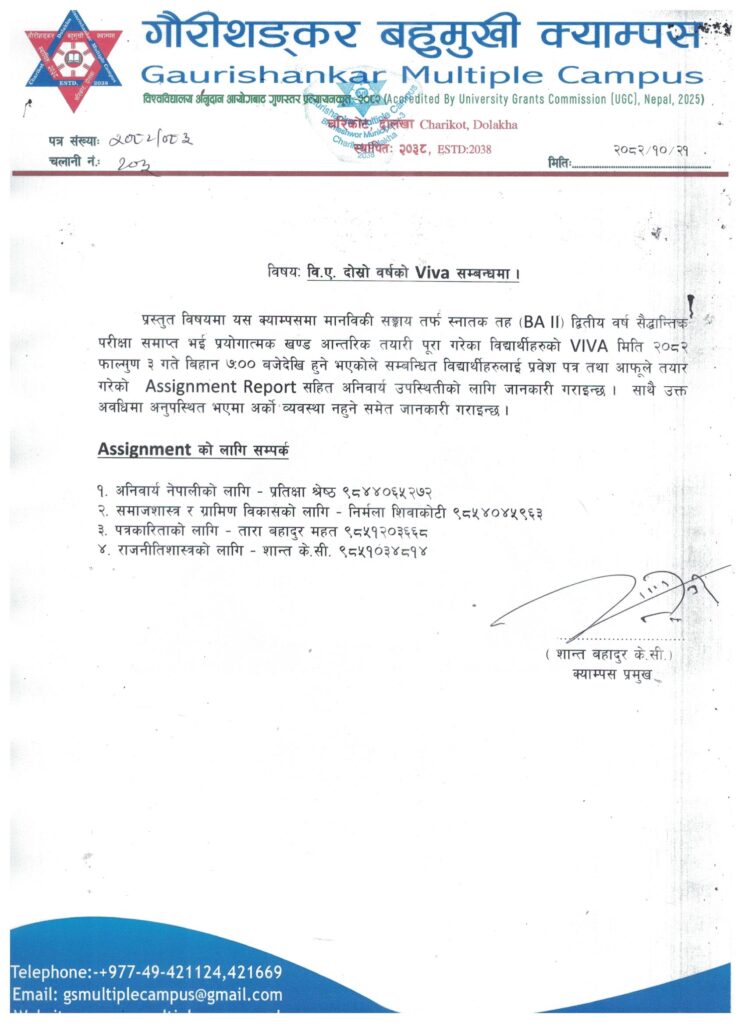 प्रस्तुत विषयमा यस क्याम्पसमा मानविकी सङ्काय तर्फ स्नातक तह (BA II) द्वितीय वर्ष सैद्धान्तिक परीक्षा समाप्त भई प्रयोगात्मक खण्ड आन्तरिक तयारी पूरा गरेका विद्यार्थीहरुको VIVA मिति २०८२ फाल्गुण ३ गते बिहान ७ः०० बजेदेखि हुने भएकोले सम्बन्धित विद्यार्थीहरुलाई प्रवेश पत्र तथा आफूले तयार गरेको Assignment Report सहित अनिवार्य उपस्थितीको लागि जानकारी गराइन्छ । साथै उक्त अवधिमा अनुपस्थित भएमा अर्को व्यवस्था नहुने समेत जानकारी गराइन्छ ।