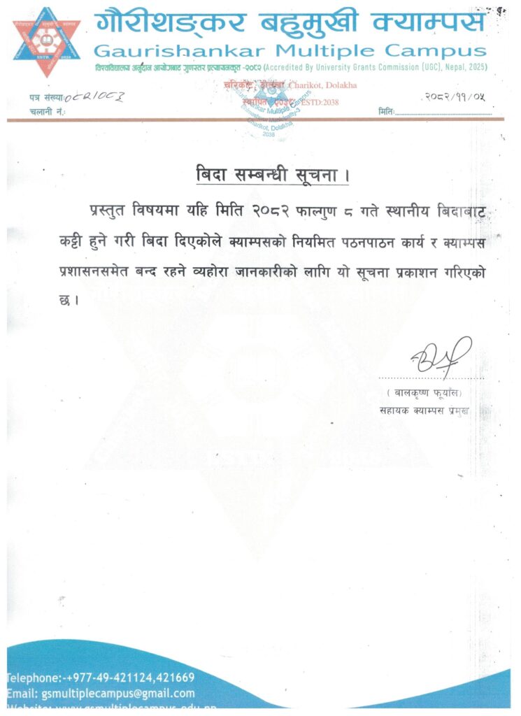 प्रस्तुत विषयमा यहि मिति २०८२ फाल्गुण ८ गते स्थानीय बिदाबाट कट्टी हुने गरी बिदा दिएकोले क्याम्पसको नियमित पठनपाठन कार्य र क्याम्पस प्रशासनसमेत बन्द रहने व्यहोरा जानकारीको लागि यो सूचना प्रकाशन गरिएको छ ।