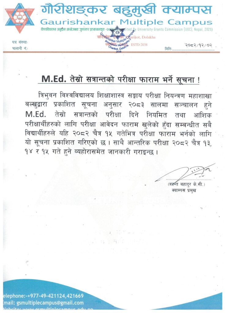 त्रिभुवन विश्वविद्यालय शिक्षाशास्त्र सङ्काय परीक्षा नियन्त्रण महाशाखा बल्खुद्वारा प्रकाशित सूचना अनुसार २०८३ सालमा सञ्चालन हुनेM.Ed. तेस्रो सत्रान्तको परीक्षा दिने नियमित तथा आंशिक परीक्षार्थीहरुको लागि परीक्षा आवेदन फाराम खुलेको हुँदा सम्बन्धीत सबै विद्यार्थीहरुले यहि २०८२ चैत्र १५ गतेभित्र परीक्षा फाराम भर्नको लागि यो सूचना प्रकाशित गरिएको छ । साथै आन्तरिक परीक्षा २०८२ चैत्र १३, १४ र १५ गते हुने व्यहोरासमेत जानकारी गराइन्छ ।