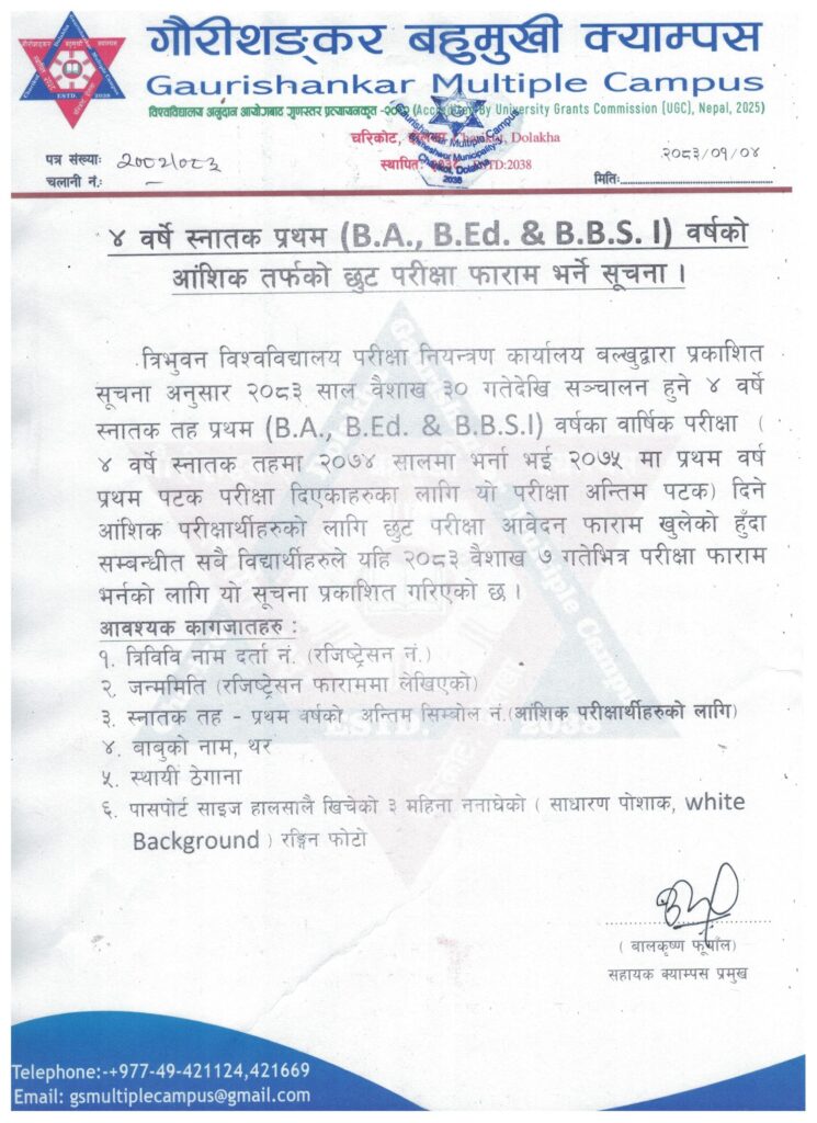त्रिभुवन विश्वविद्यालय परीक्षा नियन्त्रण कार्यालय बल्खुद्वारा प्रकाशित सूचना अनुसार २०८३ साल वैशाख ३० गतेदेखि सञ्चालन हुने ४ वर्षे स्नातक तह प्रथम (B.A., B.Ed. & B.B.S. I) वर्षका वार्षिक परीक्षा (४ वर्षे स्नातक तहमा २०७४ सालमा भर्ना भई २०७५ मा प्रथम वर्ष प्रथम पटक परीक्षा दिएकाहरुका लागि यो परीक्षा अन्तिम पटक) दिने आंशिक परीक्षार्थीहरुको लागि छुट परीक्षा आवेदन फाराम खुलेको हुँदा सम्बन्धीत सबै विद्यार्थीहरुले यहि २०८३ वैशाख ७ गतेभित्र परीक्षा फाराम भर्नको लागि यो सूचना प्रकाशित गरिएको छ ।